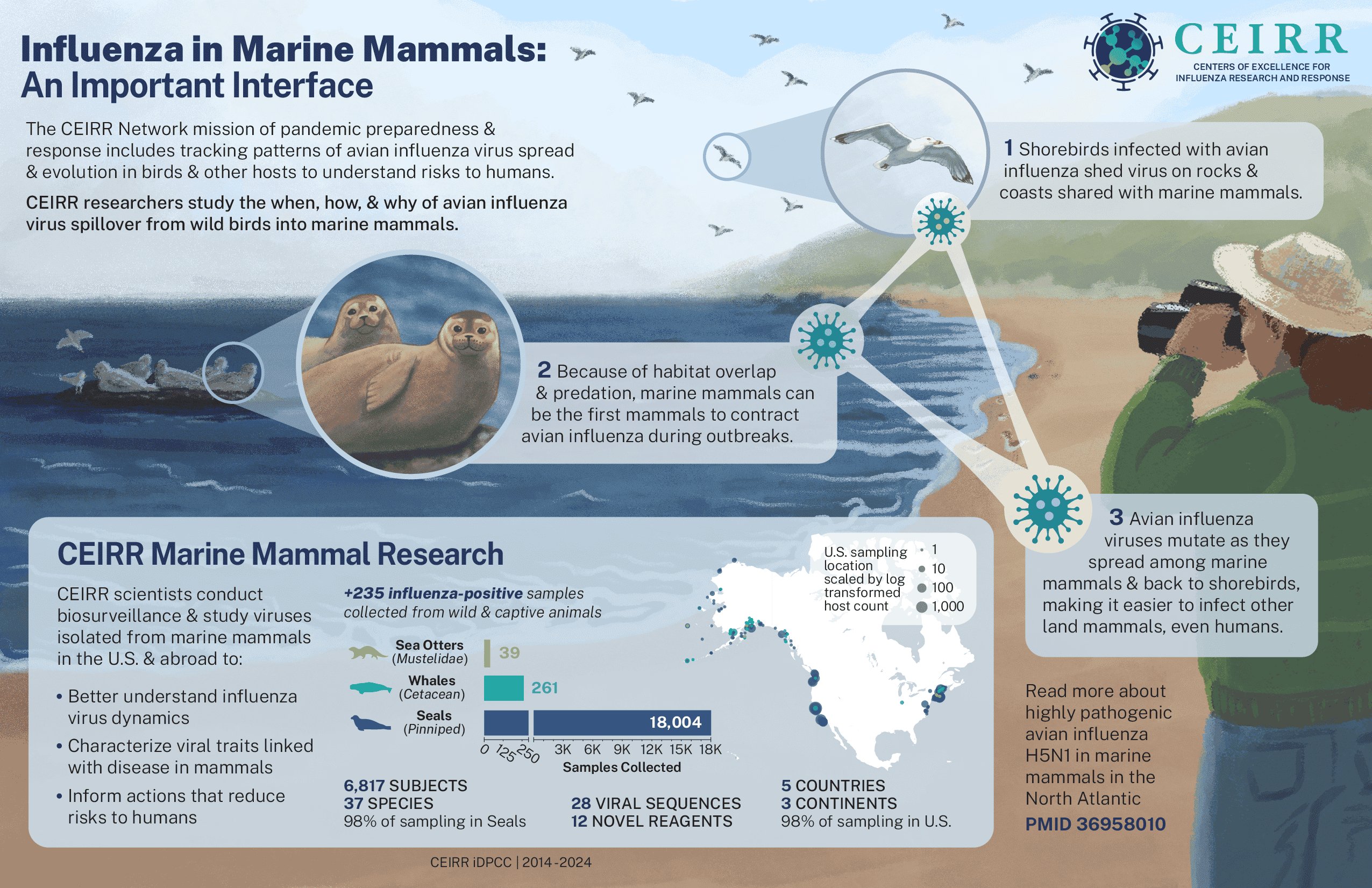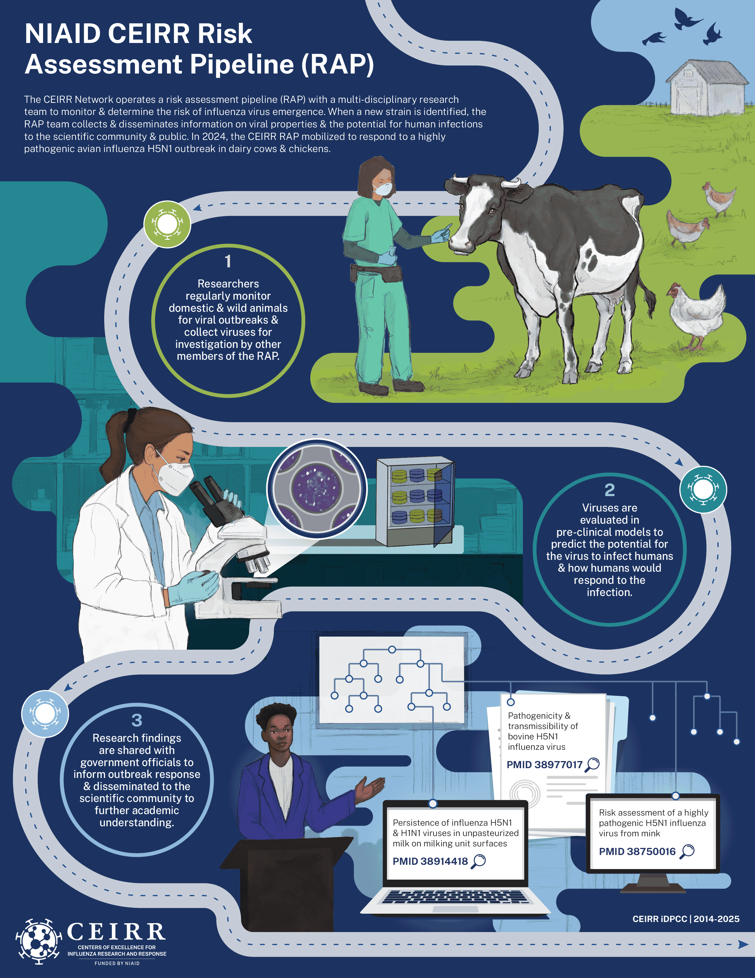 Some of CEIRR’s notable viral surveillance and pandemic response efforts are illustrated in the infographic and infobytes (smaller, “byte”-sized infographics) below. The data presented on these graphics span a previous iteration of the program, called CEIRS, through present day, from 2014 – 2025.