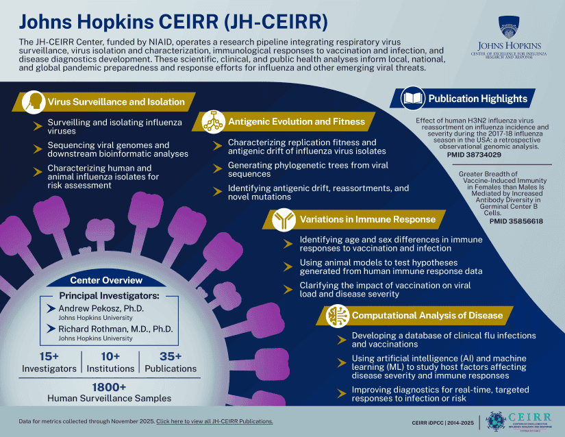 The CEIRR Network studies the natural history, transmission, and pathogenesis of influenza and other respiratory viruses that have the potential to cause seasonal disease and potentially new outbreaks. The seven multidisciplinary and collaborative research Centers provide an international research infrastructure to address respiratory viral outbreaks. One such Center, the Johns Hopkins University CEIRR (JH-CEIRR), operates a research pipeline integrating respiratory virus surveillance, virus isolation and characterization, immunological responses to vaccination and infection, and disease diagnostics development. Under the leadership of Andrew Pekosz, Ph.D. and Richard Rothman, M.D., Ph.D., both at Johns Hopkins University, JH-CEIRR’s studies cover four major themes: