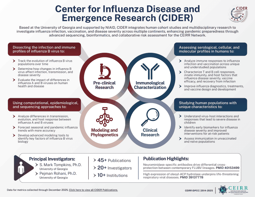 Composed of seven multidisciplinary and collaborative Centers, the CEIRR Network aims to understand the natural history, transmission, and pathogenesis of influenza, and provide an international research infrastructure to address respiratory viral outbreaks. One such Center, the Center for Influenza Disease and Emergence Research (CIDER), seeks to “understand the natural history of influenza viruses to explain why influenza viruses emerge and cause severe disease, as well as predict virus emergence, trajectory, and impact.” Under the leadership of S. Mark Tompkins, Ph.D. and Pejman Rohani, Ph.D., both at the University of Georgia (UGA), CIDER’s research stands on four interconnected pillars:
