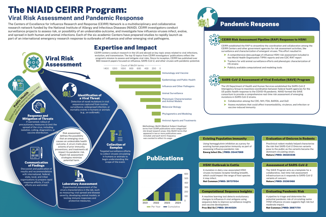 The National Institute of Allergy and Infectious Diseases (NIAID) funds the Centers of Excellence for Influenza Research and Response (CEIRR) Program, a multidisciplinary and collaborative research network that studies the natural history, transmission and pathogenesis of influenza and other respiratory viruses. A particular emphasis of CEIRR’s network of investigators is viral risk assessment, or the characterization of how a virus may cause an undesirable health outcome to humans or animals. The CEIRR Network is organized into six academic research Centers that generate data on influenza biology, immunology, and epidemiology, among other topics, while also preparing emergency response infrastructure to address influenza outbreaks.